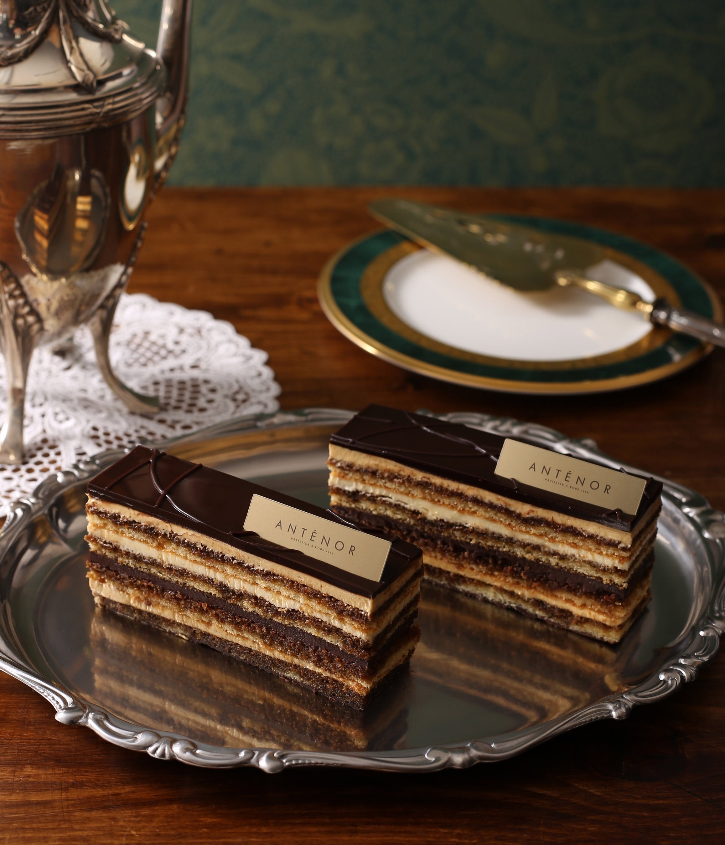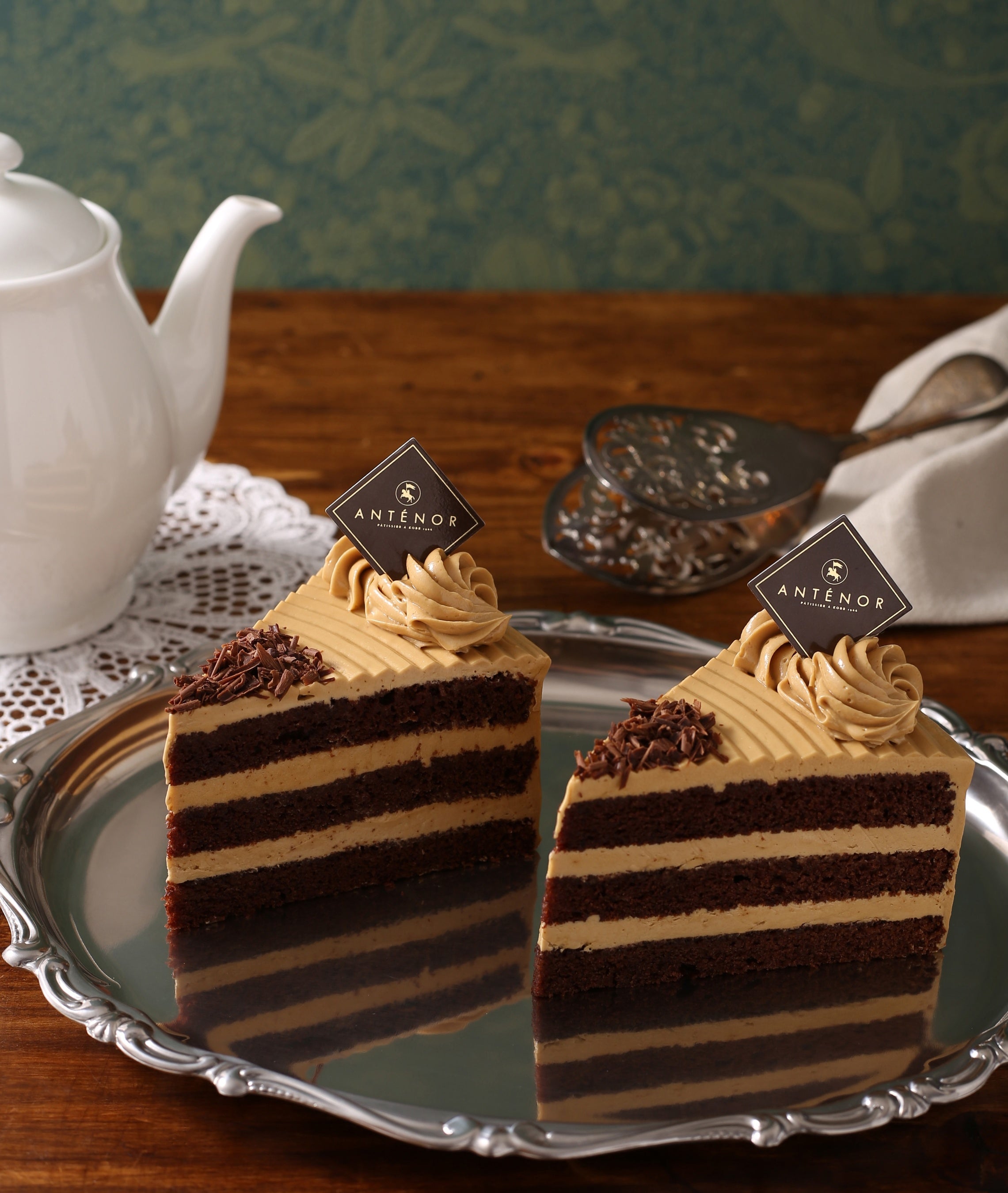 まろやかなプラリネバタークリームとガナッシュ、ほろ苦いコーヒーシロップを染み込ませたアーモンドスポンジを幾重にも重ねた、ショコラとコーヒーが溶け合う至福の味わいです。