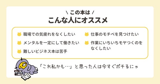 大好評の『にゃるほど!作業が遅いで悩まなくなる仕事術図解100』の第2弾として、「仕事のメンタル本も見たい!」という多くの要望の声から誕生しました。