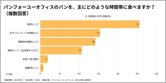 「昼食」(51.2%)が最多でしたが、「おやつ」(30.8%)、「残業時の軽食」(28.4%)といった利用も多く見られました。オフィスでのパンは、ランチ需要だけでなく、働き方の変化に合わせて間食・補食としての役割も果たしています。