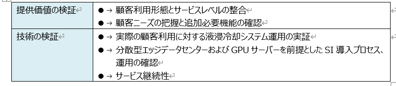 2025年11月頃から約6ヶ月にわたり、液浸冷却システム「KAMUI」を活用したAI基盤導入・運用検証に向けたPoCを実施する予定です。今回は主に以下の項目を検証し、その結果をもって新サービスの本格的な開発・提供へと移行します。