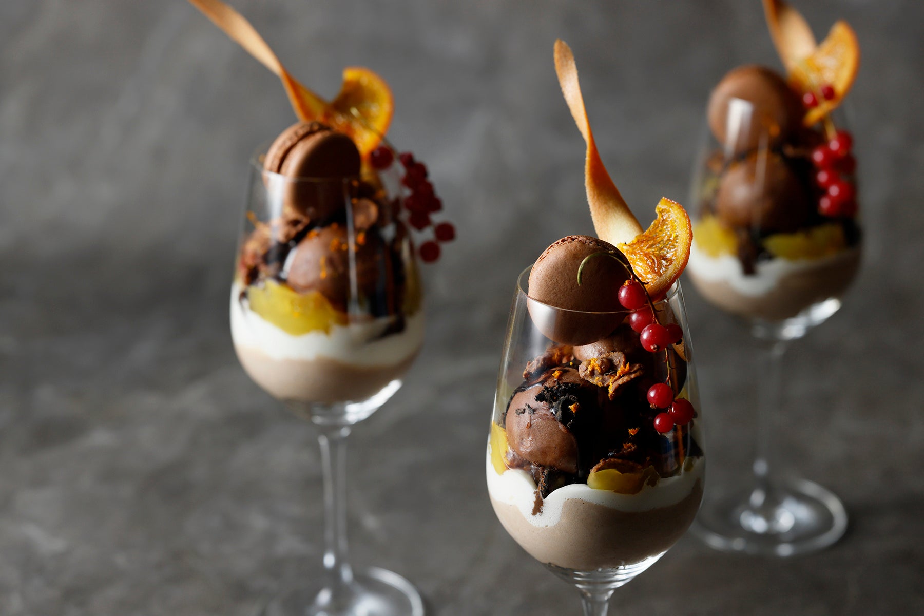 11・12月は、芳醇なグランマルニエをまとったオレンジと、幾重にも重なるショコラの深い味わいが魅力の「大人のショコラオレンジパフェ」が登場いたします。グラスの中には、しっとりとしたチョコレートブラウニーと濃厚なチョコレートアイスを重ね、香り豊かなトリュフを加えました。オレンジピールのほろ苦さと赤スグリの爽やかな酸味とのハーモニーが溶け合う、奥行きのある味わいです。チュイールやグラノーラの軽やかな食感が余韻を引き立て、一口ごとに広がる豊かで上品な大人の味わいをお楽しみください。