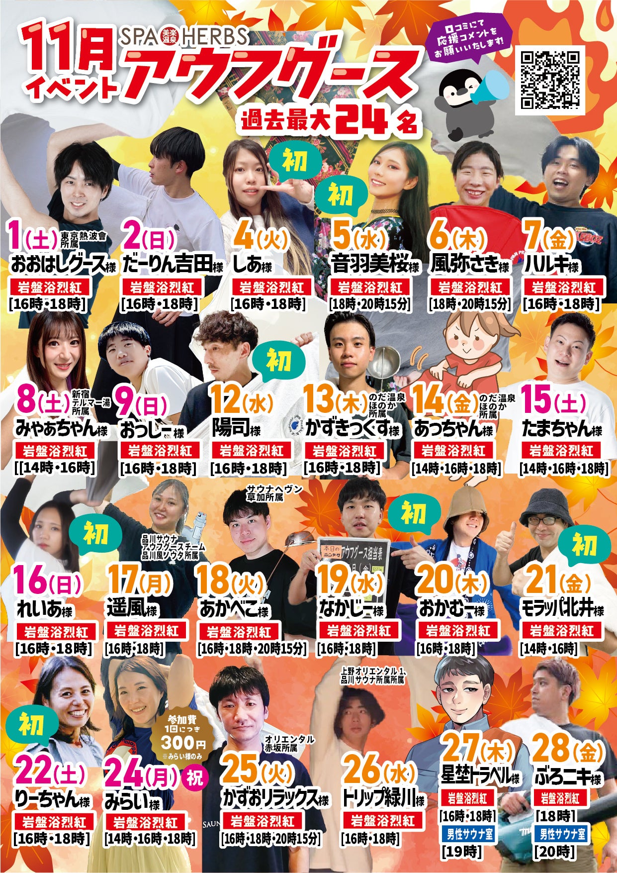 日頃のご愛顧への感謝の意を込め、11月を「アウフグース超強化月間」として、過去最大となる24名のアウフギーサーに連日ご登場いただきます。日替わりで登場する熱波師たちが、極上の「熱波」と「癒し」をお届けし、未だかつてない「ととのい」体験を提供いたします。
