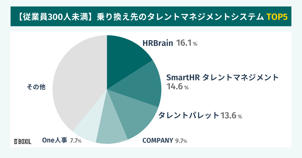 従業員300人未満の中小企業で、タレントマネジメントシステムの乗り換え導入に携わった403人に乗り換え先を聞いたところ、「HRBrain」が最多でした。回答が多かった順に下記となりました。