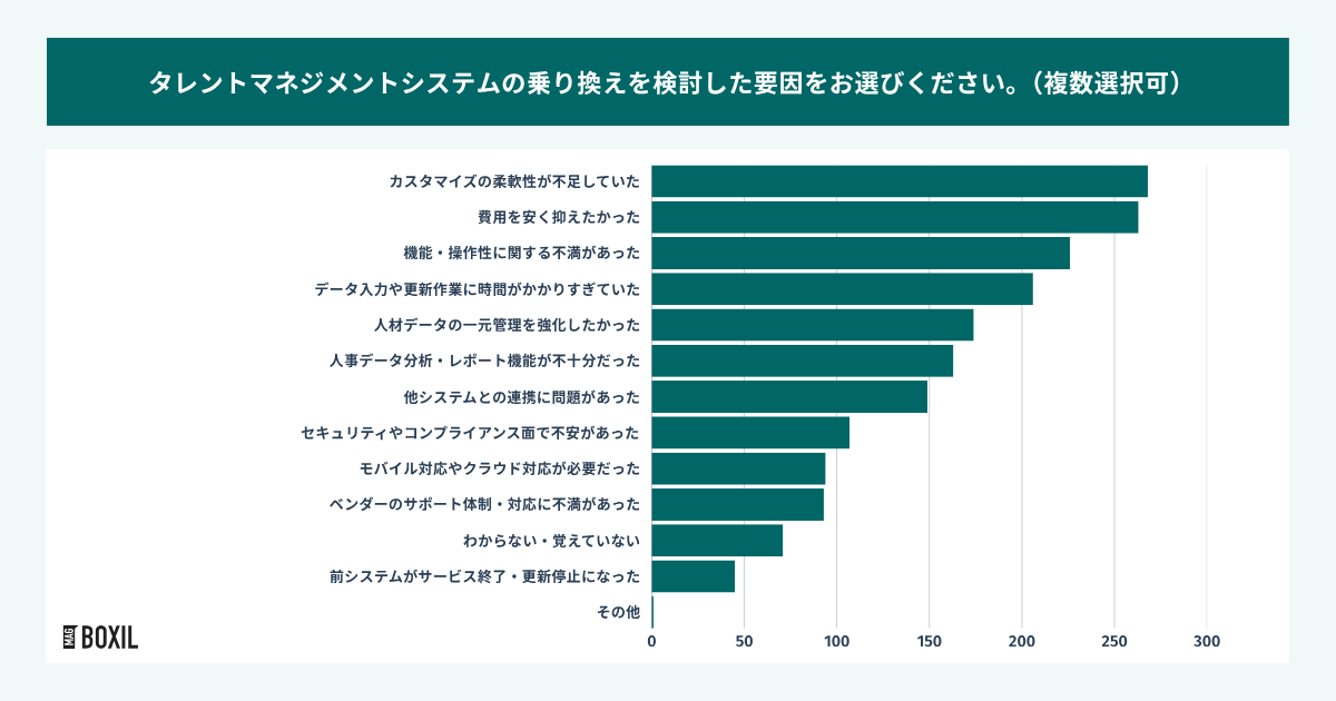 最も多かった回答は「カスタマイズの柔軟性不足」であり、自社が運用する評価制度や組織構造にシステムが対応できないことが要因となっています。また「機能・操作性」「データ入力・更新」といった業務適合性や「費用」といったコスト面も大きな乗り換え要因となっていることが明らかになりました。