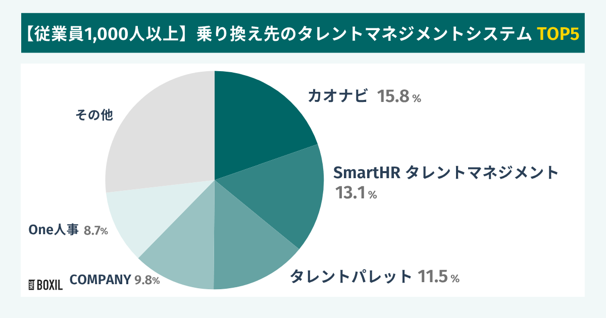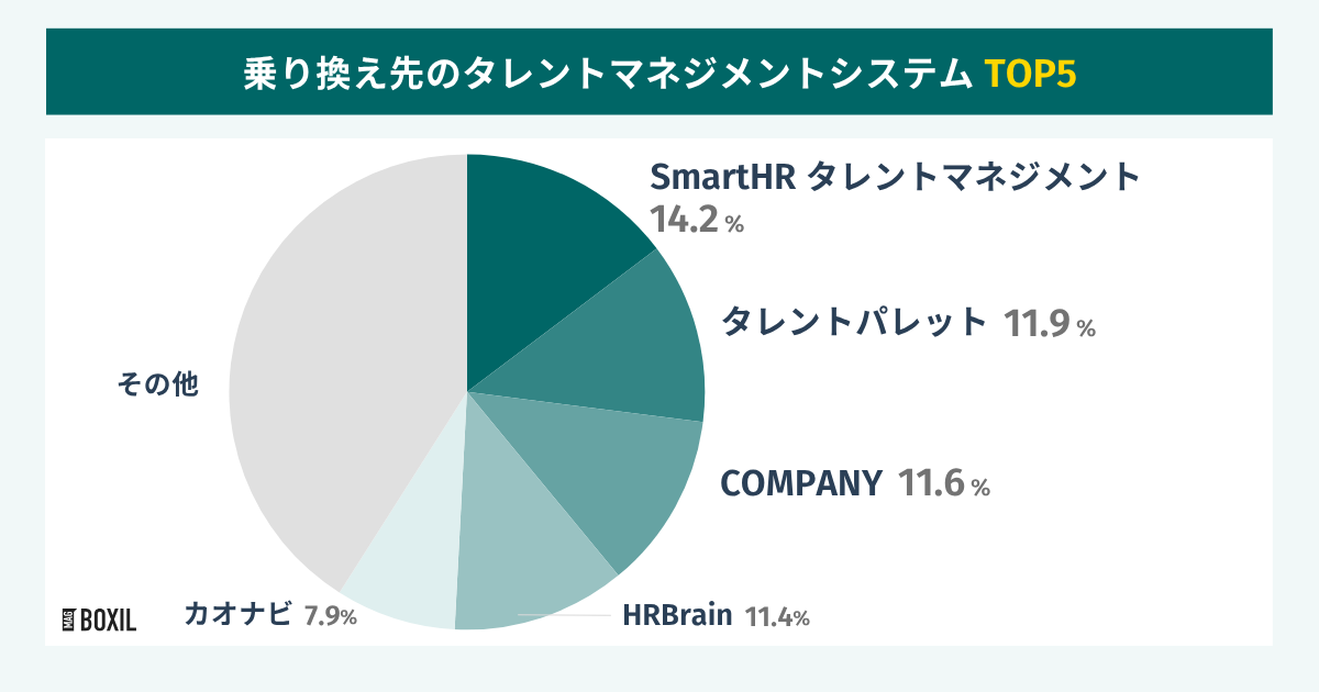 乗り換え先として最も多く選ばれたタレントマネジメントシステムは「SmartHRタレントマネジメント」次いで「タレントパレット」、「COMPANY」となり、多かった順に並べると下記でした。