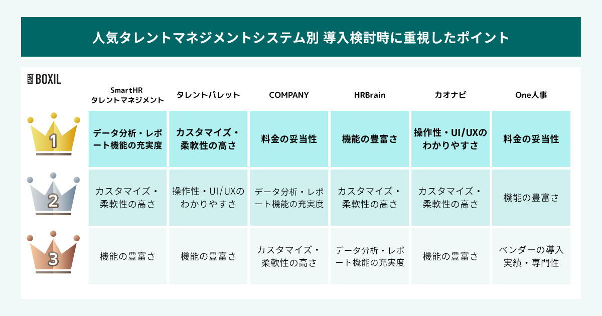 また、乗り換え先を選定する際に重視したポイントを複数選択可で尋ねたところ「SmartHRタレントマネジメント」では「データ分析・レポート機能の充実度」が、「タレントパレット」は「カスタマイズ・柔軟性の高さ」が、「COMPANY」は「料金の妥当性」が最も評価され、サービスごとの特徴が現れる結果となりました。