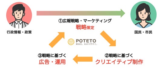 PoliPoliが意見収集~政策立案した情報をもとに、POTETOの持つ行政に特化した広報技術で住民・国民に届くデザイン・広報物を制作します。