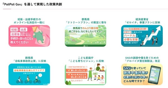 PoliPoliは、行政に声を届けるウェブサイト『PoliPoli Gov』などを通じて、住民と行政の対話を促進し、デジタル時代における「広聴」の仕組みをアップデートし、さまざま政策共創を実現しています。