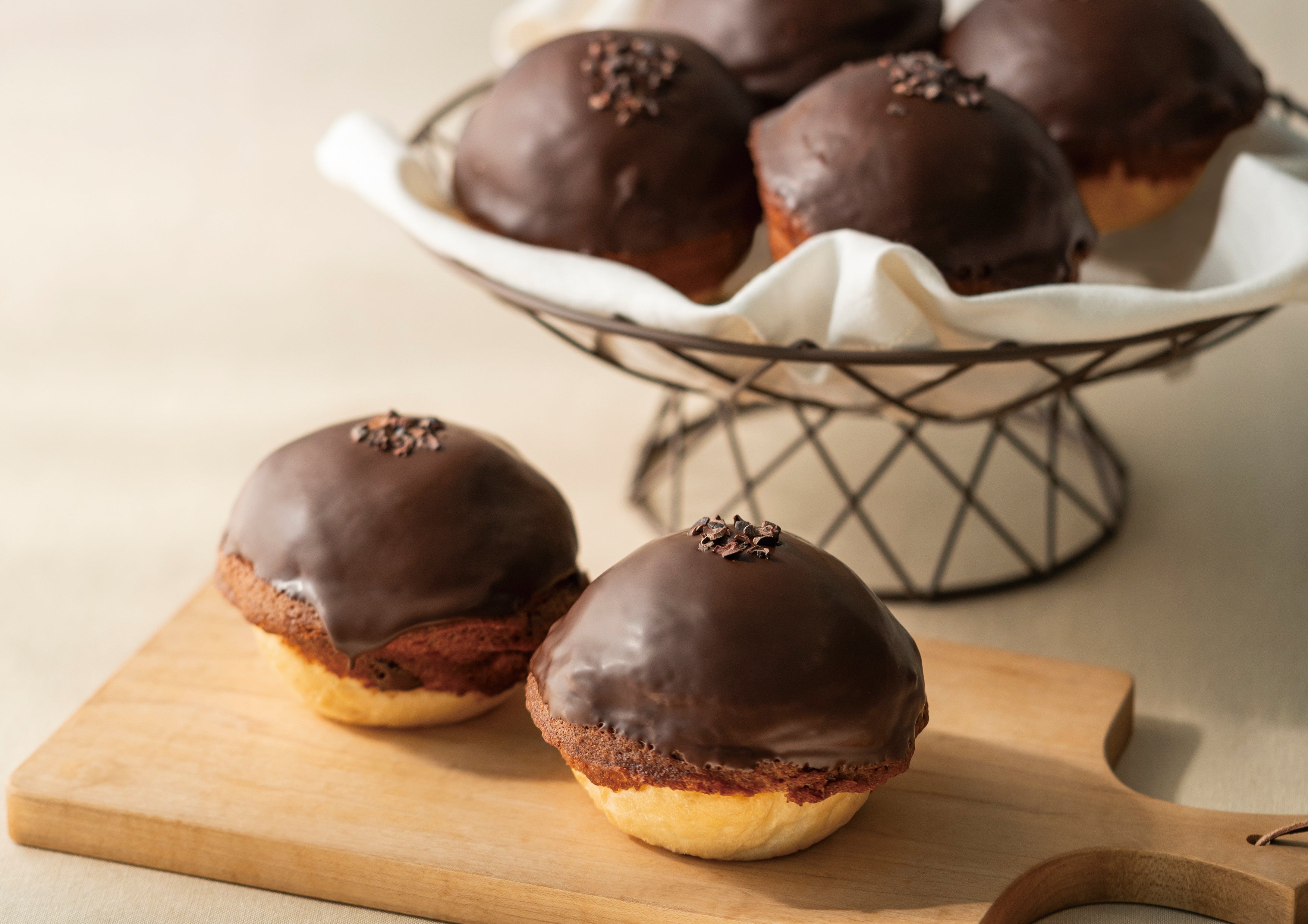 みんなの人気もの丸くてかわいいブールパン。ふんわりとした生地にさっくりとしたココア生地の帽子をかぶせて焼き上げました。