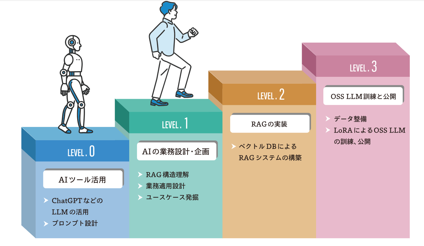 本校で学べるAI講座の学習ステップ(イメージ)※LEVEL.4(社会に貢献する基盤モデルの研究・公開)、LEVEL.5(AGI開発・世界規模での展開・社会統治に対応可能)についても、ご本人の修得状況に応じて学んでいけるようカリキュラムをご用意しています。
