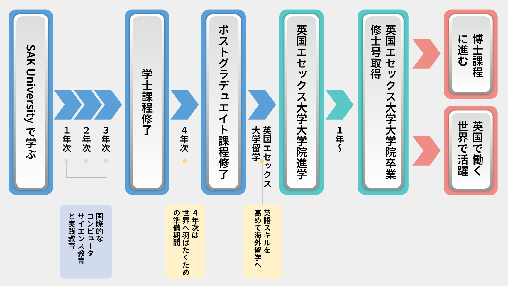 SAK Universityで4年間の課程を修了して英国国立エセックス大学の卒業資格(学士号)、(ポストグラデュエイト・ディプロマ)を取得後、英国エセックス大学大学院へ留学が可能です。英国で修士号の取得、博士号取得や英国での就業を視野に入れることが可能となります。