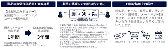 デロンギ製品をご購入いただいたお客様に、安心して製品を長くご愛用いただくため、ご購入後のメーカー無償保証期間の延長、万が一の際の迅速な修理対応といったアフターケアを大幅に拡大し提供いたします。また、メンバー限定の先行情報として、新商品やセールなどの最新情報もいち早くお届けいたします。