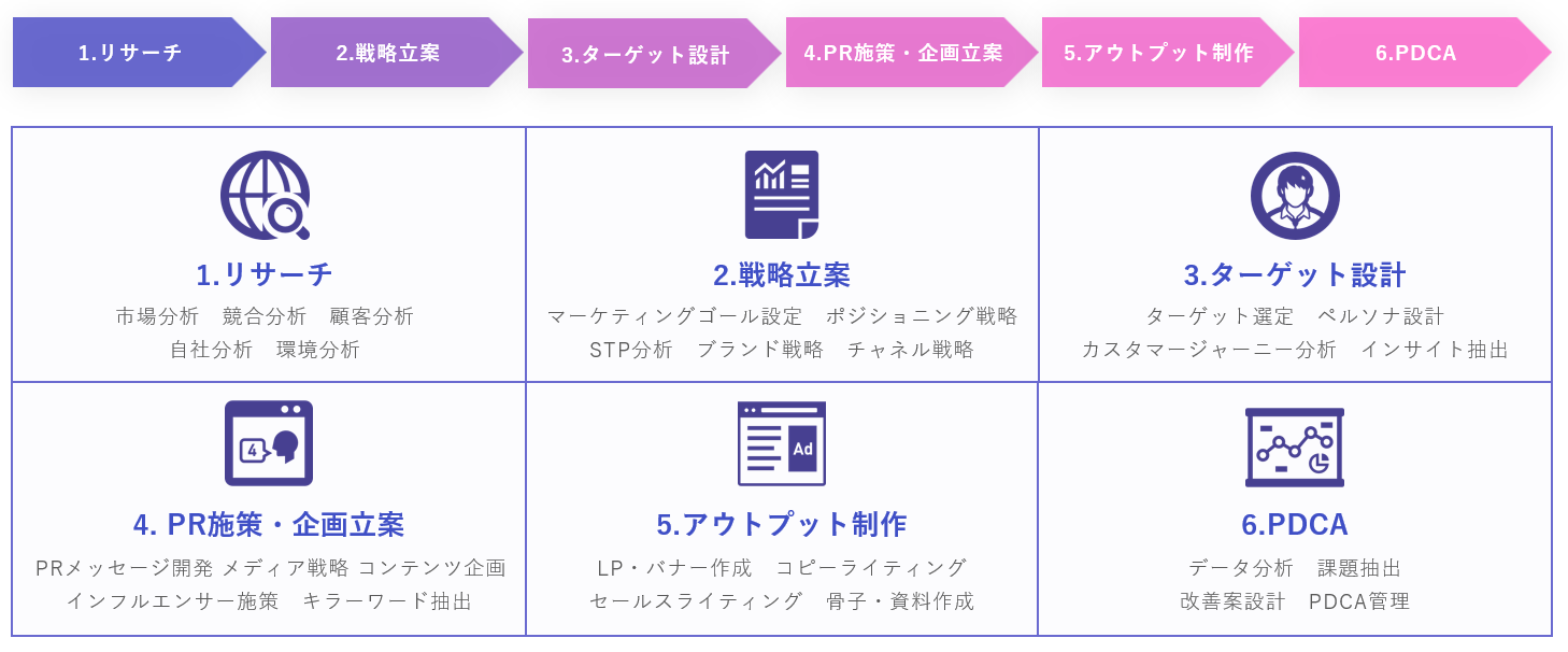 SNS・EC・Web・アプリ・論文など、あらゆるデータを自動収集・分析し、リサーチ、戦略立案、施策実行、効果測定までを一気通貫で実行。