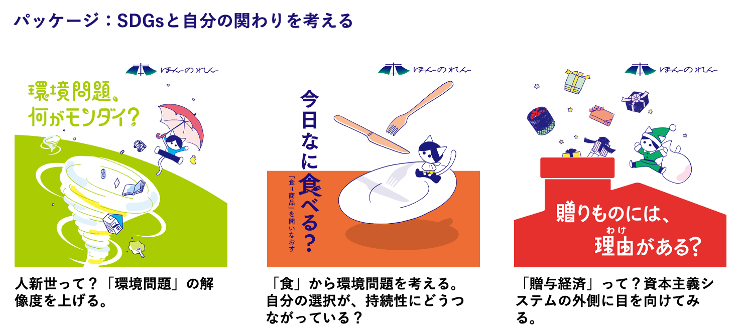「ほんのれん」では、3テーマをパッケージにして活用いただくことをおすすめしています。テーマを横断してワークショップすることで、より多角的に思考・探究することが可能になります。