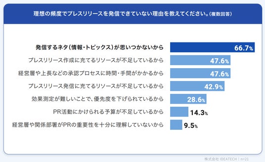 プレスリリースは強力な広報手段ですが、「発信できるネタがない」と悩む担当者は少なくありません。当社調査でも、理想の頻度で発信できていない理由の最多は「発信するネタ不足」(66.7%)でした。
