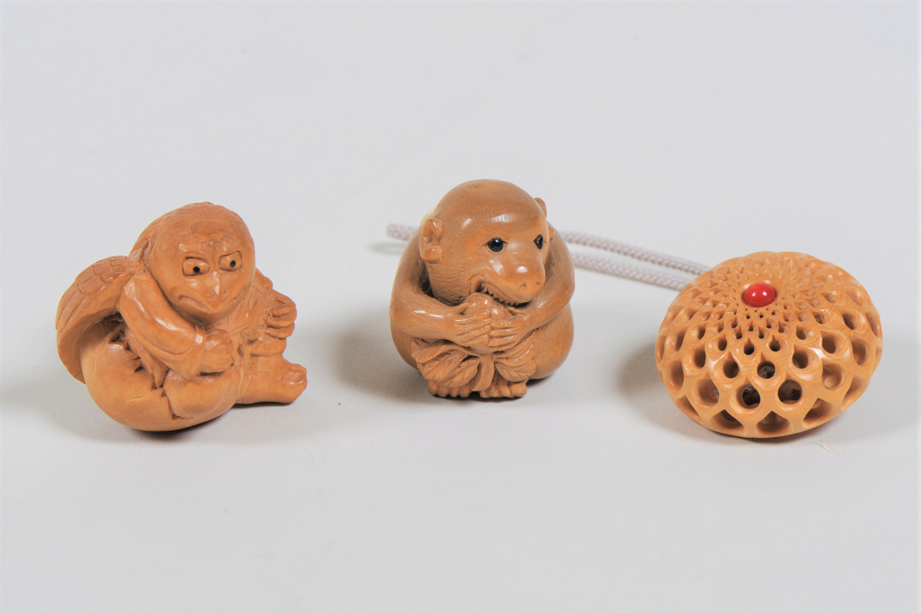 伊勢の根付は、巾着、煙草入れ等を腰に下げる時、紐の端に付ける留め具で、江戸時代に流行しました。非常に堅い材質の地元産「朝熊黄楊」を材料とし、磨耗に強いのが特徴です。三重県指定伝統工芸品にも認定されています。
