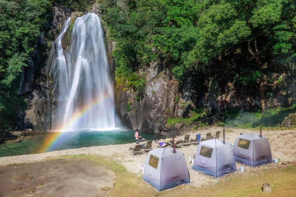 かつての紀州藩主が「飛沫さながら雪の舞い」と称えた美しい滝を臨むことができるキャンプ場。BBQやコテージなど家族で楽しめる施設やアクティビティのほか、近年注目されているテントサウナもあり、熱せられた体を滝つぼで冷やし、自然の中での外気浴で「ととのう」ことができる癒しの空間です。