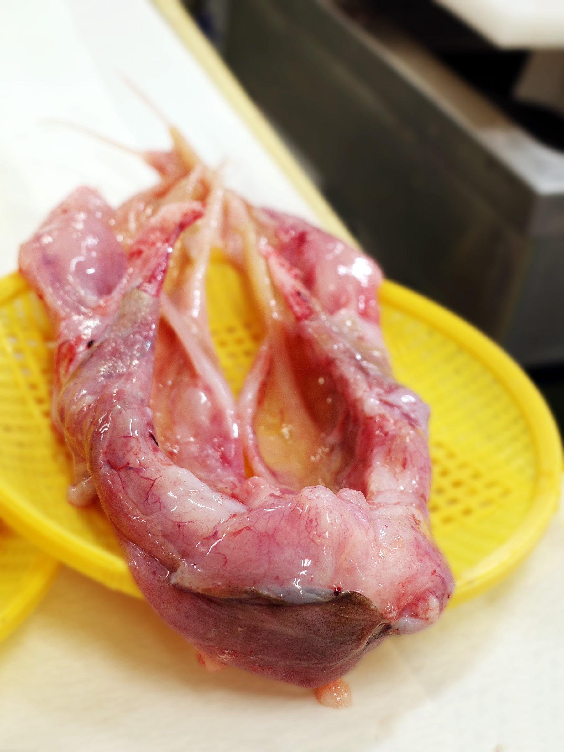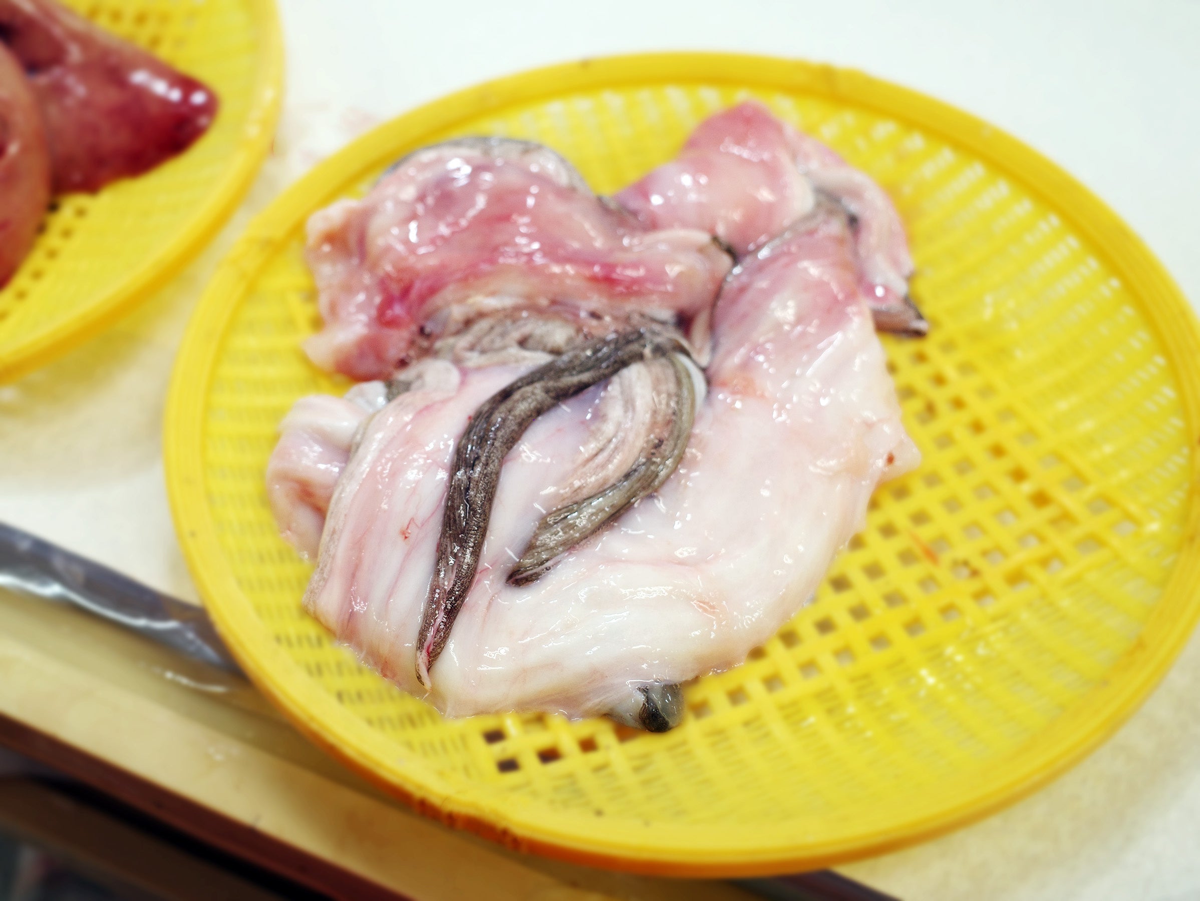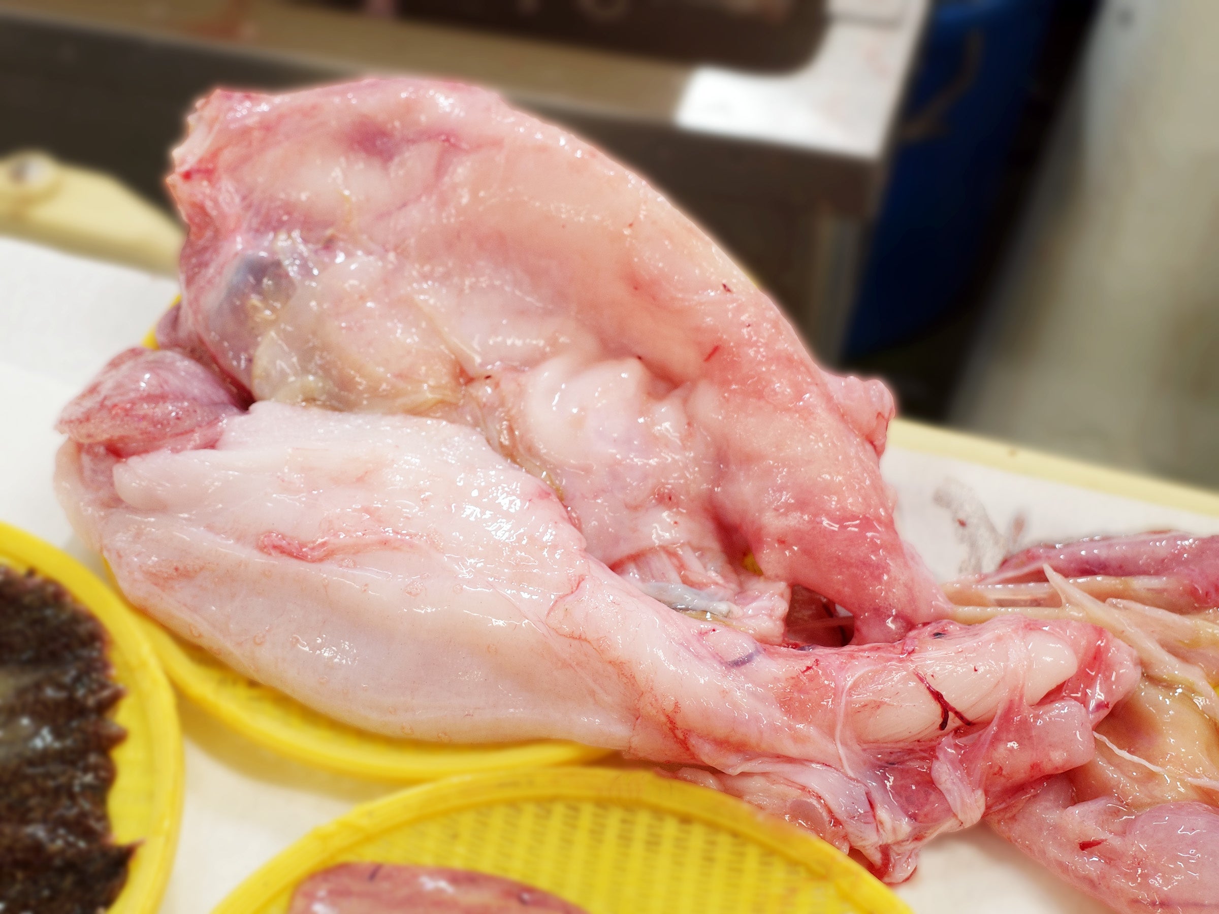 市場から出荷される時点で、実はあんこうの胃腸は抜かれています。市場用語で「腹抜き」というのですが、これは鮮度を保つためだそうです。