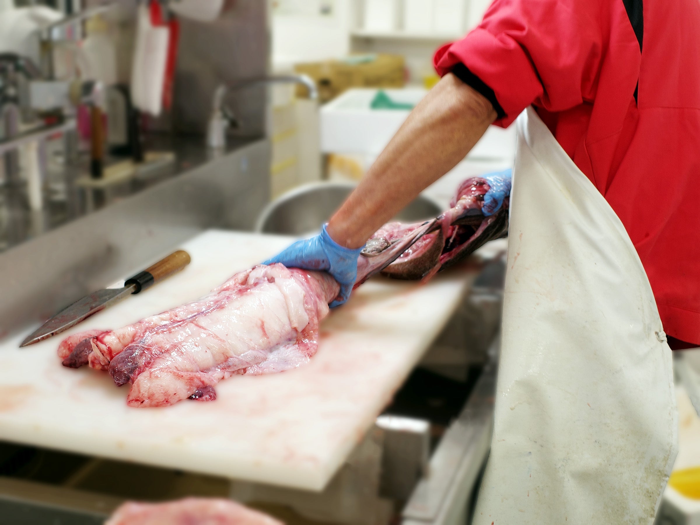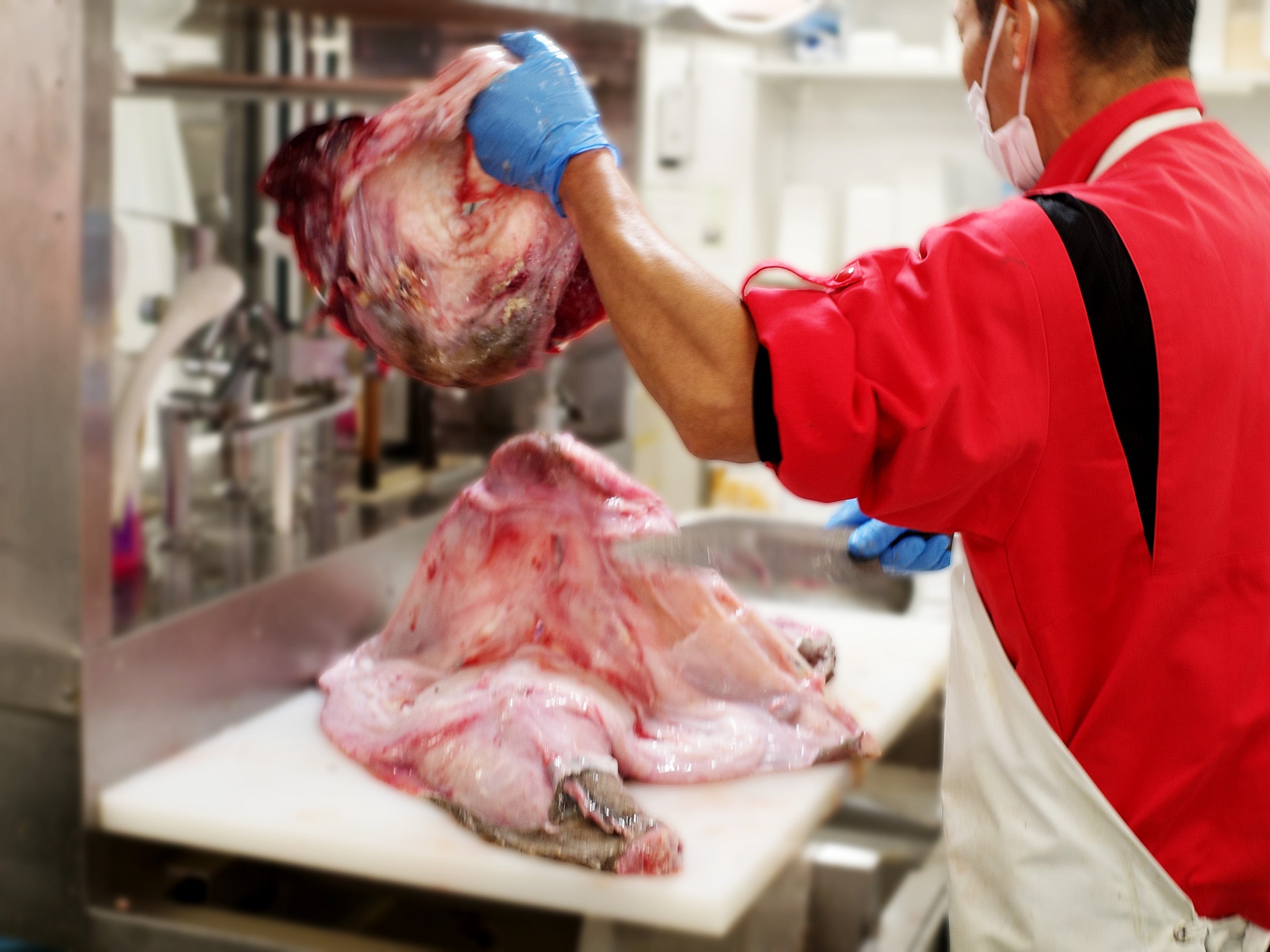 この後さらに、見た目からは想像もつかない上品で淡白、プリプリおいしい白身の部位などに、切り分けていきます。