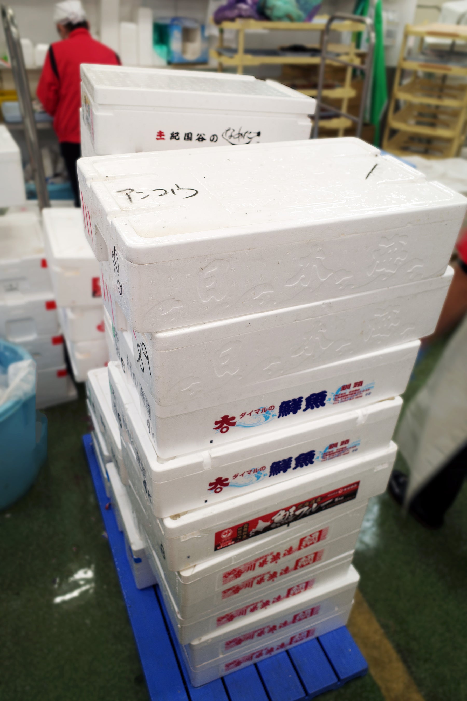 お店のバックヤードに高く積みあがる市場直送の箱 一番上には「アンコウ」の文字