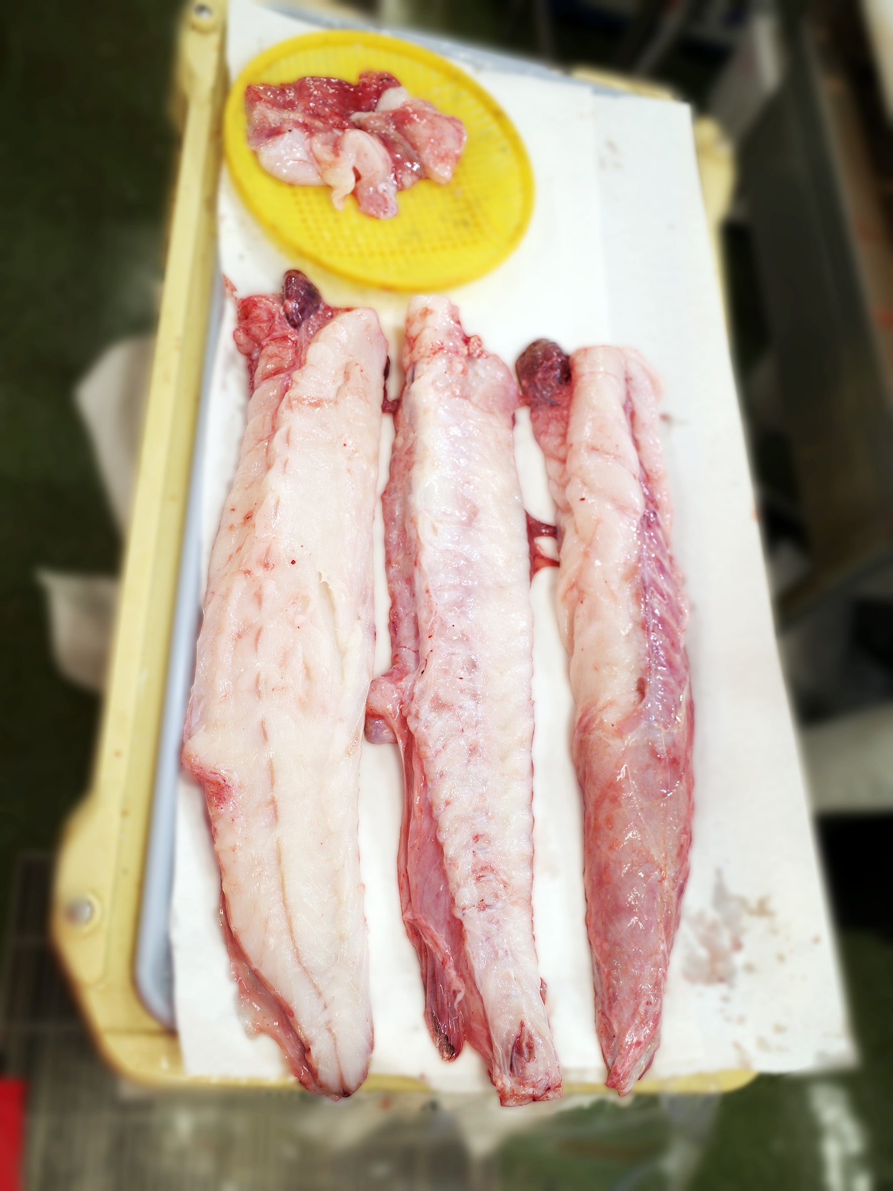 まずはヒレや尾を落として、皮をむいていきます。このヒレや尾、そして皮は、ゼラチン質でプルプルとおいしくなる部位ですので、絶対に捨てません!