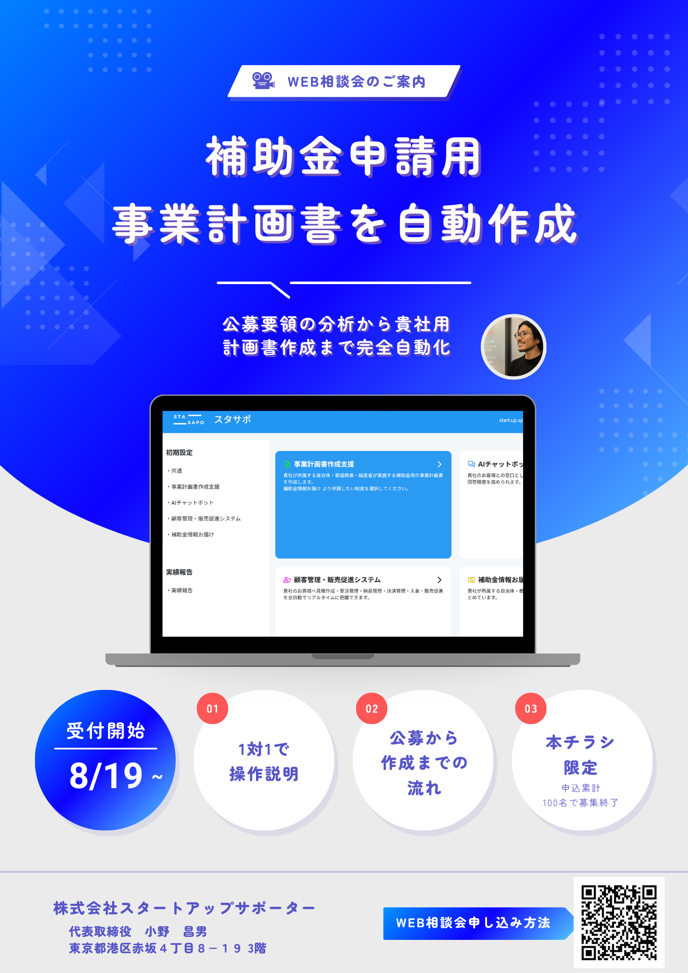 「地域の中小企業が補助金を活用して成長することは、日本経済の活性化に直結します。しかし、申請書類の作成は専門知識が必要で、多くの企業が諦めているのが現状です。スタサポのテクノロジーと、地域に根差した専門家の皆様の知見を組み合わせることで、より多くの中小企業を支援できると確信しています。特に、来年施行される行政書士法改定に対応した形で、安心して参画いただける体制を整えました。ぜひ一緒に、日本の中小企業を支えていきましょう。」