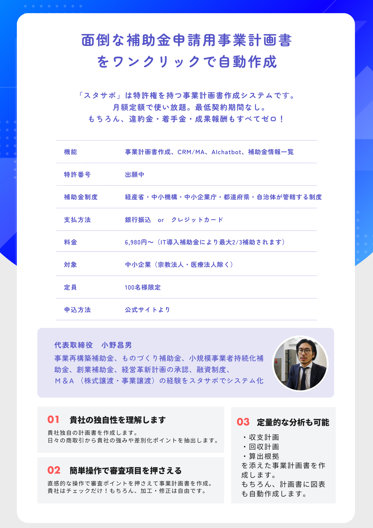 :自動作成機能により申請書作成時間を大幅削減。例えば、小規模事業者持続化補助金の審査項目を抑えた事業計画書を20分で作成可能。もちろん、入力から出力までの時間です。審査項目を抑えるので、収支計画表も作成します。