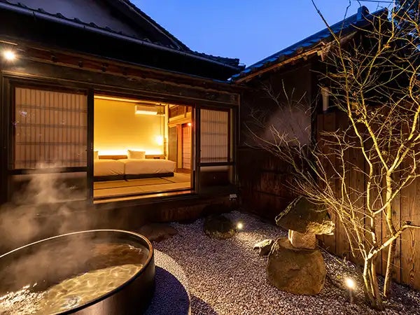 ツアーでは、藁葺きの趣ある離れ「藁の家」または数寄屋造りの雅やかな「梅の間」にご宿泊いただきます。いずれのお部屋も木の温もりに包まれ、専用の露天風呂でゆったりとした時間をお楽しみいただけます。