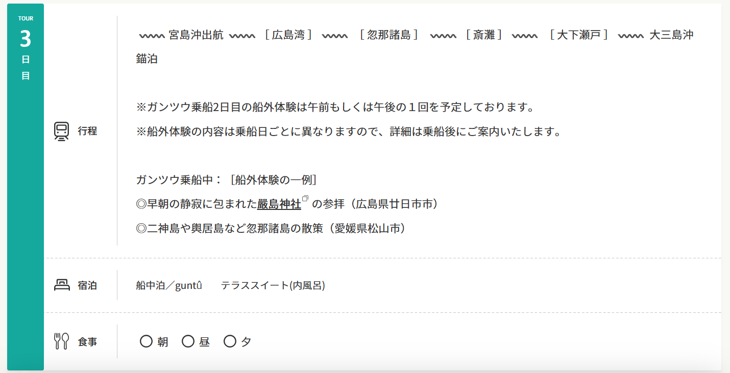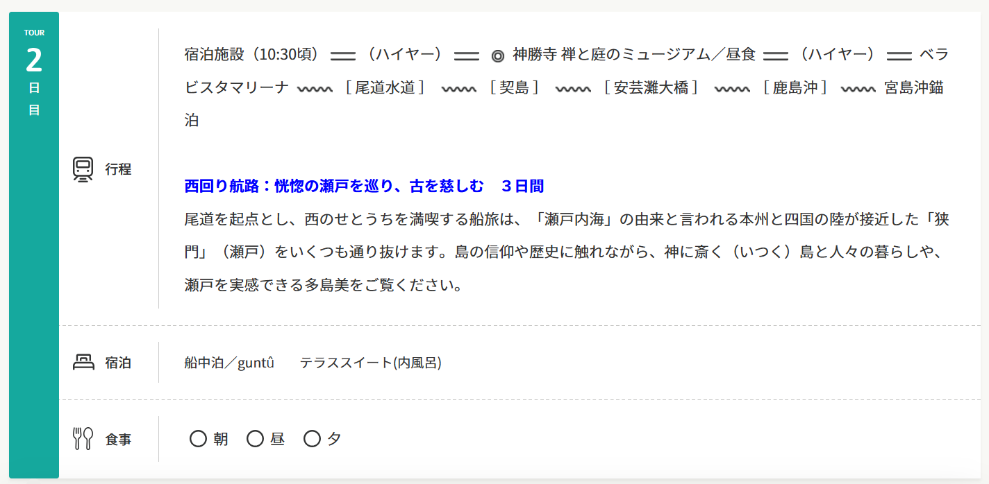 - 季節ごとに移ろいゆく瀬戸内海の風景と一体になり、「ただ、過ぎゆく時を愉しむ」、そんな穏やかでのんびりとした旅をお楽しみください。
