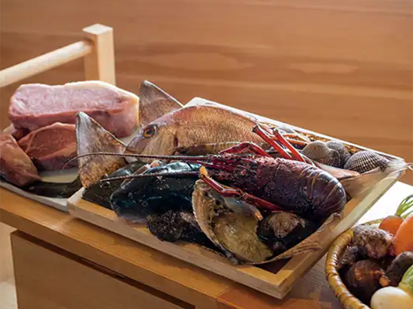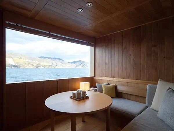 建築家・堀部安嗣氏のデザインによる太陽や海の色を映し出すシルバー色の船体の中には、わずか17室の全室テラス付きの客室のほか、「お好きなものを、お好きなだけ」をコンセプトとするダイニング、海の見える鮨カウンター、障子越しに柔らかい光が届くラウンジ、檜の浴槽とサウナのある浴場など、思いのままにお過ごしいただける空間が広がっています。