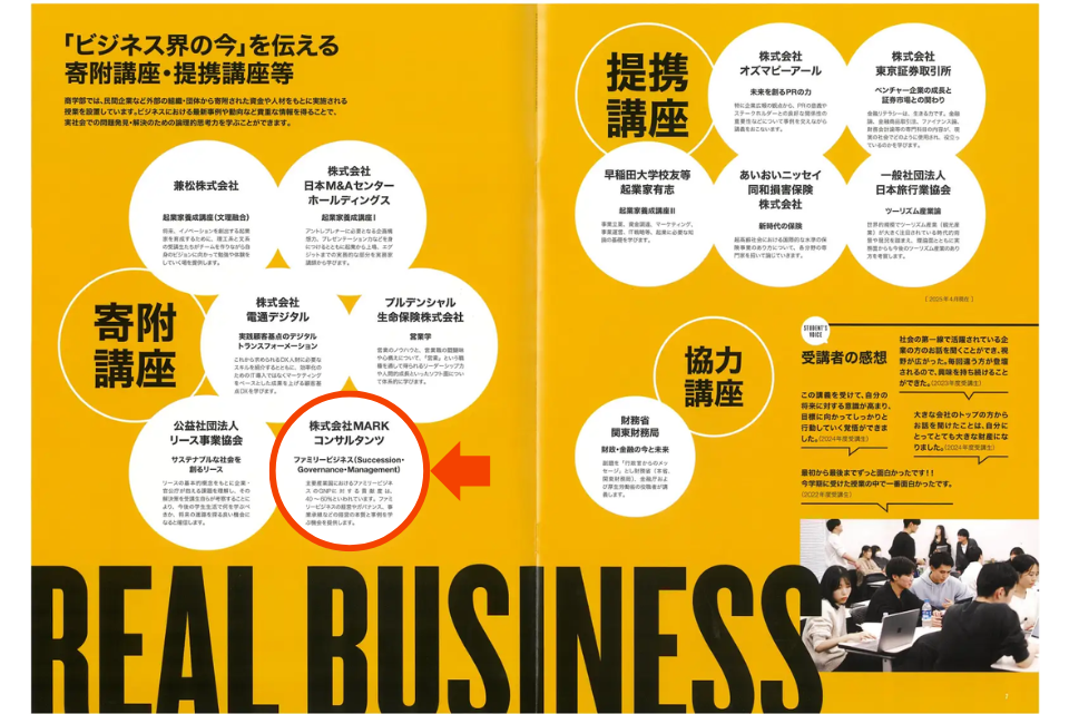株式会社MARKコンサルタンツでは、2025年度に引き続き来年度も同様の寄附講座の設置を予定しています。そこで、早稲田大学商学部寄附講座「ファミリービジネス(Succession・Governance・Management)」の趣旨に賛同される企業様から2026年度の講師を募集しています。