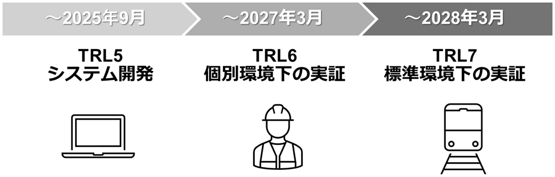 TRL5通過の結果を通じてTRL6では、鉄道事業者の実需に適うシステムを開発し、TRL7において実地での運用を目指します。