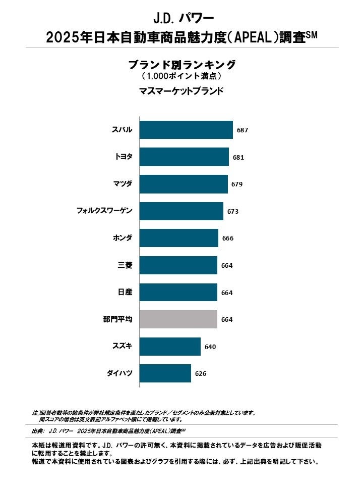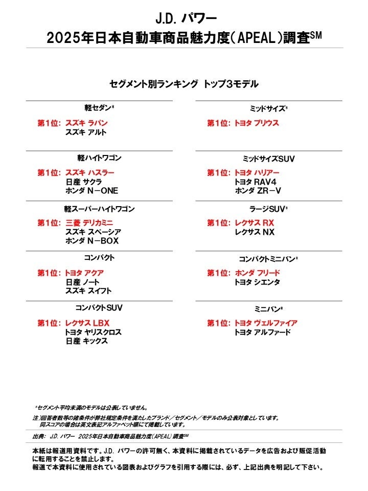 CS(顧客満足度)に関する調査・コンサルティングの国際的な専門機関である株式会社J.D. パワー ジャパン(本社:東京都港区、Japan CEO:木本卓、略称:J.D. パワー)は、2025年日本自動車商品魅力度(Automotive Performance, Execution and Layout、略称APEAL)調査の結果を発表した。