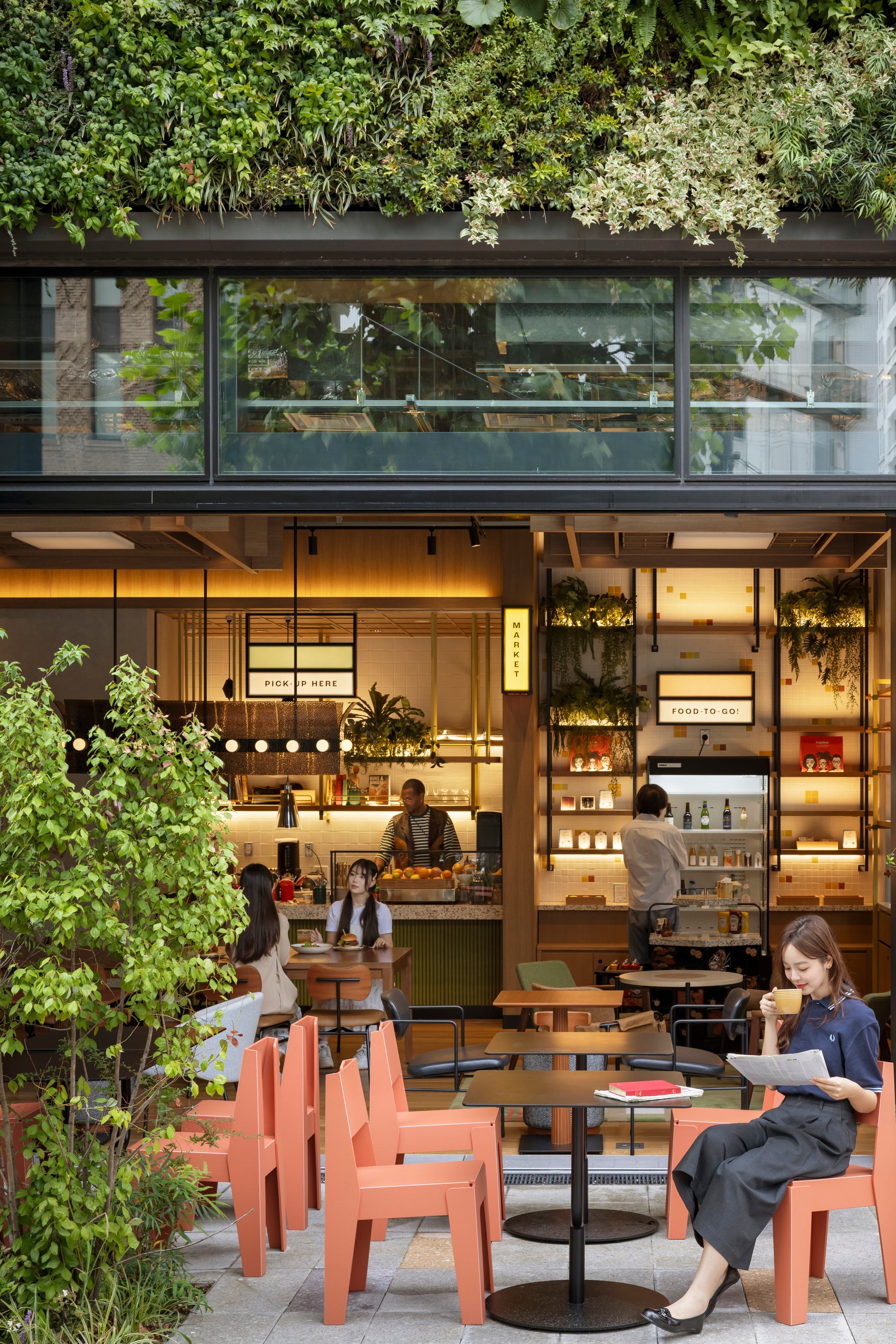 ・1・2階に焼杉と壁面緑化を用い、兜町の歴史ある街並みに自然素材の温もりを融合。