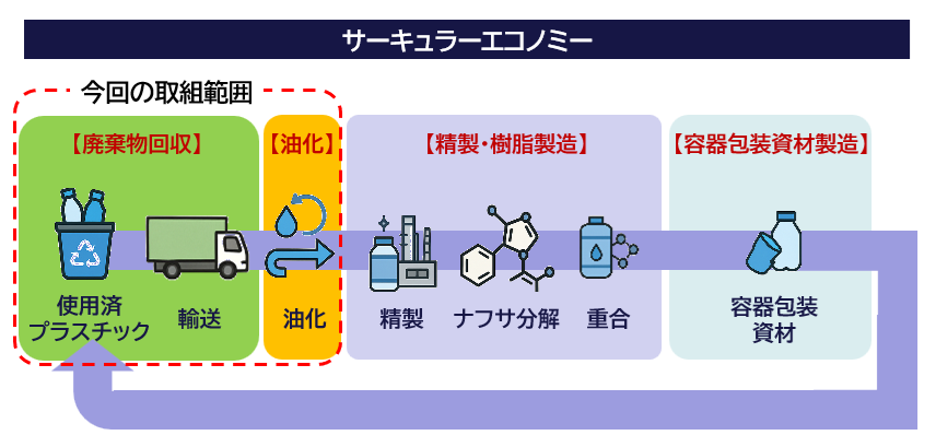 本取り組みでは、しょうゆなどの調味料を製造するキッコーマンフードテック株式会社西日本工場の製造工程で廃棄される包装資材やプラスチックボトル・キャップなどの廃プラスチックを回収し、CFP社の油化設備において分解・油化します。これにより、廃プラスチックを、食品容器包装資材の原料として再利用可能な「生成油」に変換し、資源として循環させることが可能になります。