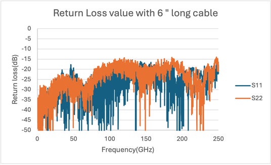「Junkosha(R) マイクロ波・ミリ波同軸ケーブルアセンブリ」0シリーズ 精密計測用位相安定タイプ 「MWX0A5」の反射損失および挿入損失の性能は以下の通りです。