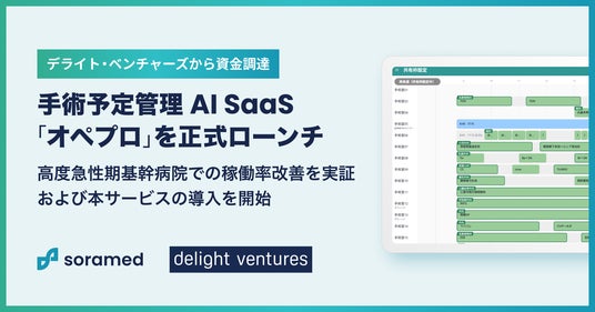 株式会社ソラメド(本社:東京都渋谷区、代表取締役:古石至章、以下「ソラメド」)は、急性期病院向け手術予定管理AI SaaS「オペプロ」を正式にローンチいたしました。中国地方内の高度急性期基幹病院におけるPoC(実証実験)では、手術室稼働率の改善効果を実現しました。あわせて、デライト・ベンチャーズ(本社:東京都渋谷区)を引受先とするシードラウンドでの資金調達を実施しました。