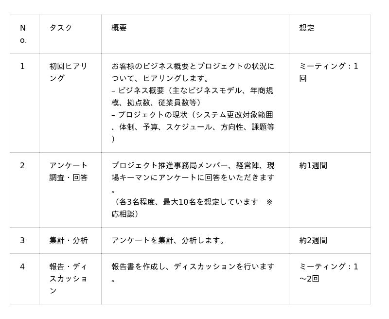 - 診断結果をもとに、候補パッケージの例や進め方についてご提案します。
