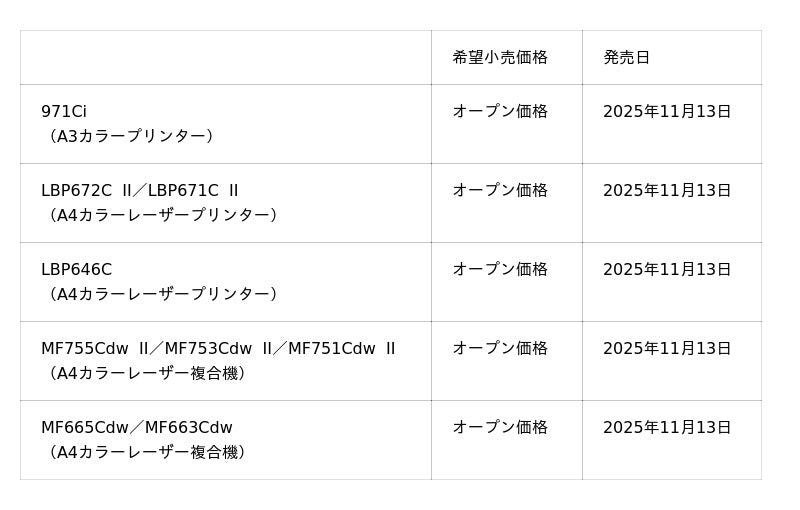 キヤノンは、ビジネス向けプリンター・複合機「Satera」シリーズの新製品として、“Satera 971Ci”など計9モデルを、2025年11月13日に発売します。