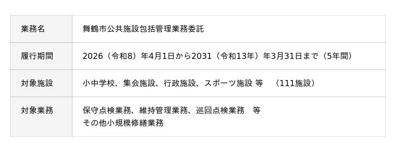 日本管財は今後、舞鶴市と詳細協議を行い、2026年3月上旬に契約締結、2026年4月から業務開始を予定しています。履行期間、対象施設、対象業務は下表のとおりです。