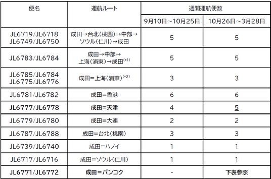(*2)JL6785/JL6784は週2便、JL6775/JL6776は週1便
