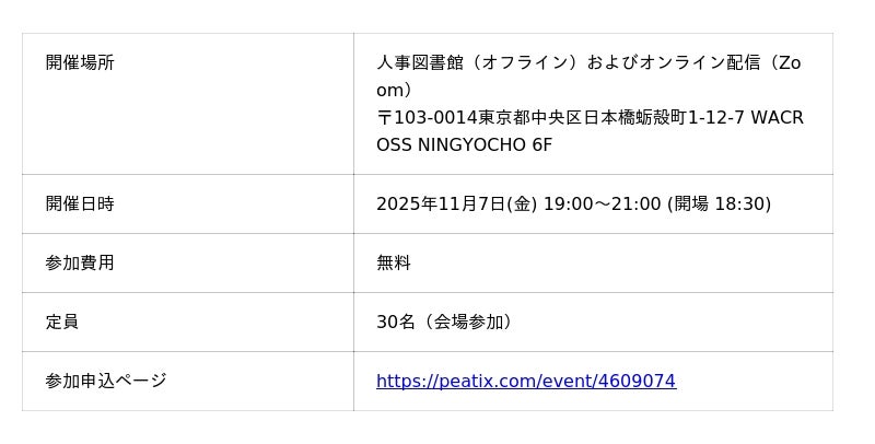 株式会社Trustyyle(本社:東京都中央区・代表取締役:吉田洋介)は、運営するコミュニティ「人事図書館」にて、2025年11月7日(金)に『マネジメントの型とは?『急成長を導くマネージャーの型』著者とマネジメントを語る』を開催します。 本イベントは、ベンチャー経営の経験からマネジメントを「100の型」として体系化した株式会社EVeM CEOの長村禎庸氏をお招きし、直接対話できる貴重な機会です。 会社で人事職についている方、マネジメントに課題を感じている管理職の方、人事や組織開発に関心のある方でしたらどなたでもご参加いただけます。ぜひお越しください。