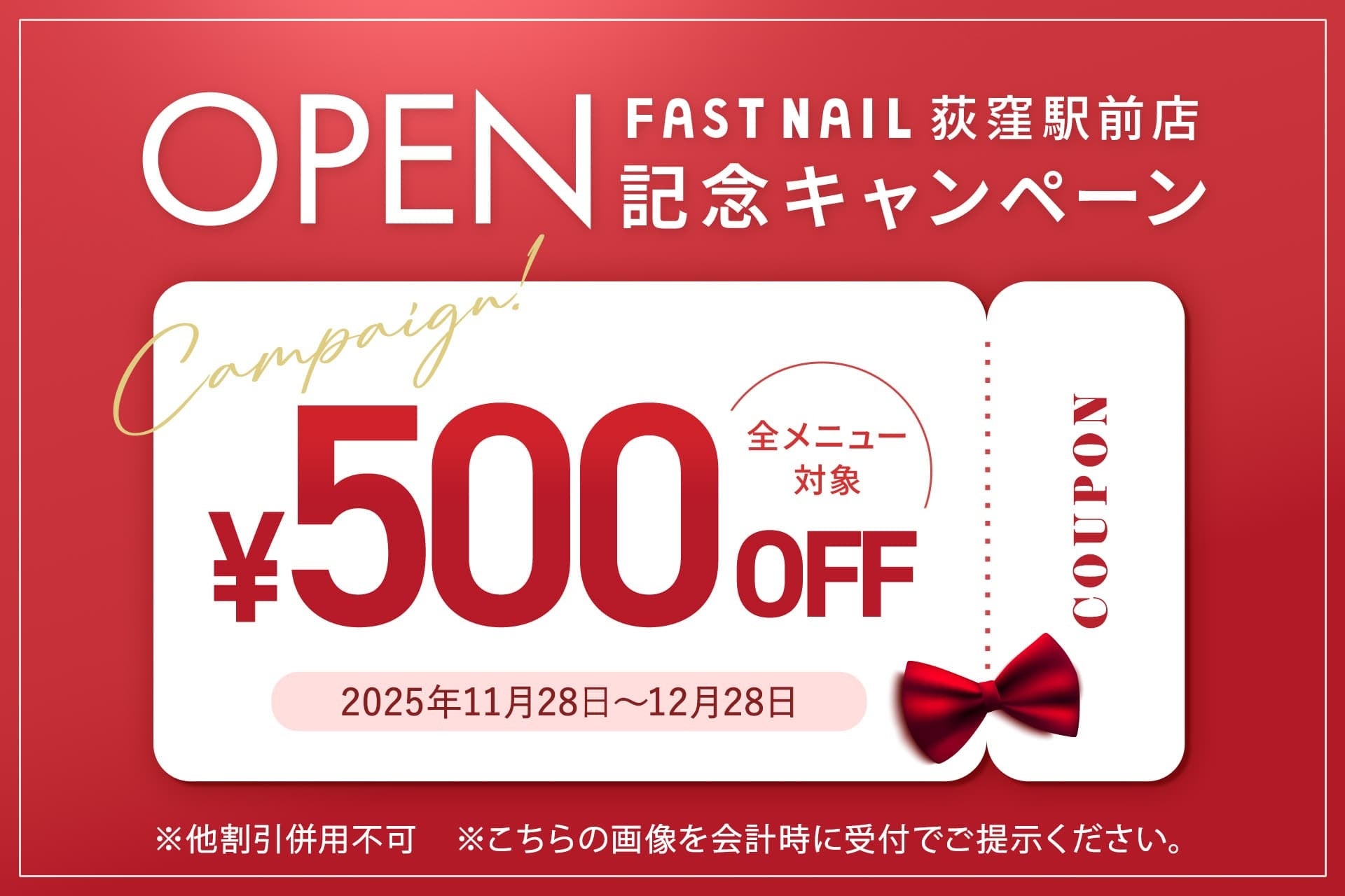 オープンを記念して「FASTNAIL 荻窪駅前店」限定で、全メニュー500円OFFキャンペーンを実施いたします。