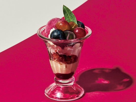 葡萄のヨーグルトサンデーフルーツの彩りとヨーグルトの純白が美しく調和する、秋の一皿。巨峰シャーベットとフルーツの爽やかな酸味を、ヨーグルトの優しい口あたりが包み込みます。仕上げにははちみつをとろりとかけて、まろやかな甘さとともにお楽しみください。