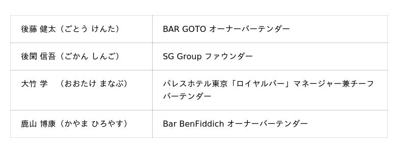 世界を代表するトップバーテンダー4名が審査員として参加し、ファイナリストの技術と創造性を厳正に審査します。