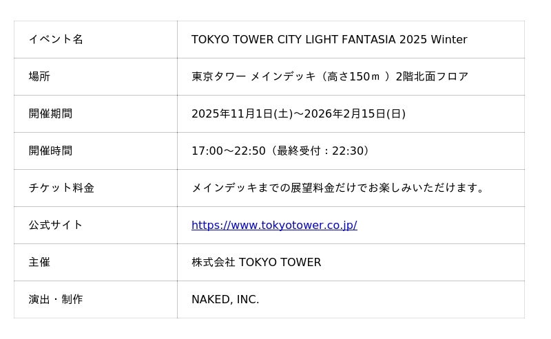 株式会社ネイキッド(英語表記:NAKED, INC. 、所在地:東京都渋谷区、代表:村松亮太郎)は、東京タワーメインデッキ(150m)2階北面フロアにて、2025年11月1日(土)~2026年2月15日(日)の期間開催されるプロジェクションマッピングショー『TOKYO TOWER CITY LIGHT FANTASIA 2025 Winter』の演出・制作を手がけています。