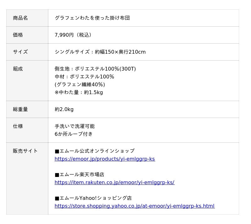 「身体に合った寝る・座る・たたむ」を提供する健康家具ブランドEMOORを展開する株式会社エムール(東京都立川市:代表取締役 高橋 幸司/以下エムール)は、2025年10月23日より「グラフェンわたを使った掛け布団」の販売を開始しました。