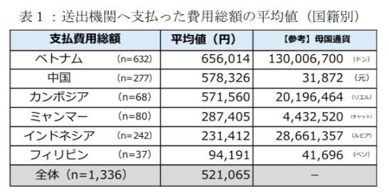 出典:法務省(技能実習生の支払い費用に関する実態調査の結果について)