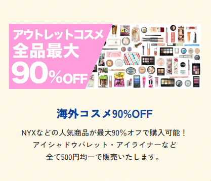 - 海外コスメ最大90%OFFセールNYXなどの人気海外コスメ商品が最大90%オフで購入できるブースも出展します。アイシャドウパレットやアイライナーなど、全ての商品を500円均一で販売する予定です。