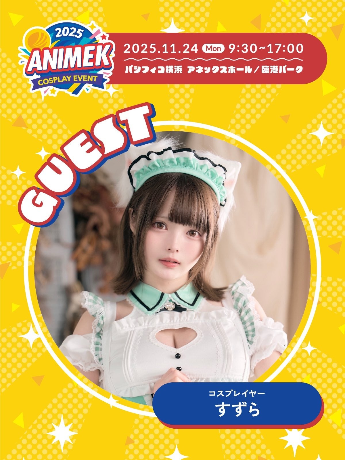 ANIMEKの初開催を盛り上げる豪華ゲストコスプレイヤーとして、猫田あしゅさん、すずらさんが来場します。会場では、このお二人を招いた撮影会を実施する予定です。また、来場者の満足度を高めるため、チェキ会やツーショット撮影の時間を設けますので、乞うご期待!
